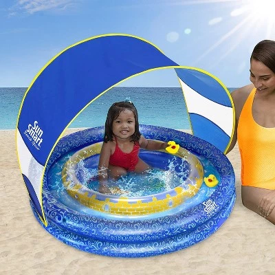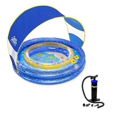 Bring the pool to your very own backyard with the Aqua Leisure SunSmart Lazy River Kiddie Pool. This child-sized pool is ideal for children ages 2 and up, keeping them cool in the summer heat and entertained for hours.This backyard kiddie pool is designed to inflate and deflate in minutes, making summer fun ready in an instant. The pool is 6 inches deep, just enough water for splashing about without needing to start learning how to tread water. Best of all, there’s a lazy river between the pool and the outer ring, providing a place to play with the 2 included ducky toys and other aquatic playthings.A sun-shade canpoy inflatable infant swimming pool is included, providing 50+ UPF protection in addition to sunscreen, making sure your little one stays sunburn-free until autumn. Included is the Aqua Heavy-Duty Dual-Action Hand Pump. This pump features a dual-action pump piston design that pumps air on both up and down strokes. This maximizes airflow, making inflating fast and simple. This set includes (1) pump, (1) hose, and (4) adapter attachments that have a universal fit. It features a stable and secure base with a wide handle that makes the pump easy to use on virtually any surface.