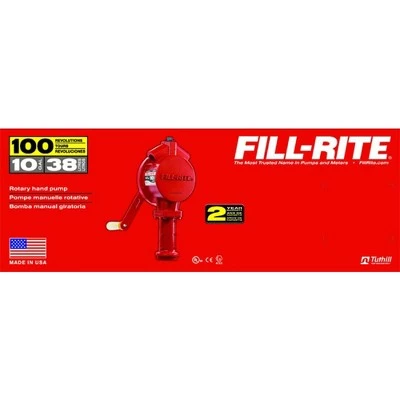 The Fill-Rite FR110 Rotary Hand Pump is a smooth, reliable solution for low volume fuel transfer from drums and barrels. This manual rotary pump has the capability to pump up to 10 gallons per 100 revolutions and is ideal for situations when no power source is available. The Fill-Rite rotary pump is compatible with several different fuel types, including gasoline, diesel, heptane, kerosene, light oils, and mineral spirits. Ensure efficiency on the job site with this hand pump that is ideal for agriculture, construction, industrial, and automotive applications where low volume transfer is needed. This hand pump includes a built-in check valve that ensures flow only when you need it and a strainer to keep fluids free from large contaminants.Refuel your equipment as quickly as possible so you can continue working efficiently. Extract and transfer your fuel wherever it needs to go with the Fill-Rite FR110 Fuel Transfer Rotary Hand Pump.