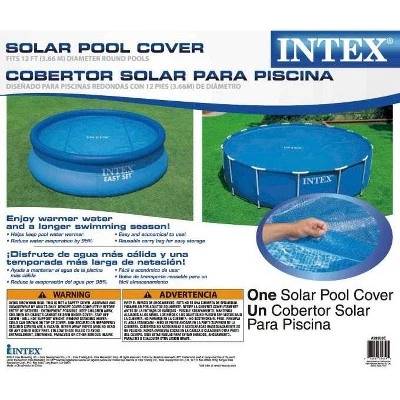 Spend more time swimming in your pool this summer and less time cleaning it with the Intex 12 Foot Solar Pool Cover. This above ground pool cover helps keep your pool free of dirt, insects and debris when not in use. In addition to covering your pool, this solar cover also harnesses the natural power of the sun to warm the water. This allows you to extend the swimming season by warming the water earlier, and keep the temperature enjoyable late in the season.This pool cover features drain holes to prevent water from accumulating on top. Having your pool covered helps to prevent evaporation which means adding less water and chemicals to your pool.Great for both 12 foot Intex Easy Set and Metal Framed Round Swimming Pools!With this Intex 12-Foot Pool Cover, you will be able to spend more time swimming in your pool this summer and less time cleaning it.This above ground pool cover helps keep your pool free of dirt, insects and debris when not in use. Constructed of high quality, durable 7-gauge, UV resistant PVC vinyl, this pool cover features drain holes to prevent water from accumulating on top. It comes with nylon rope ties and a 10-inch overhang to keep your above ground pool covered and free from debris.