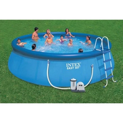 This complete Intex Easy Set Pool will give your friends and family infinite hours of refreshing, fun activity and enjoyment. Get everything you need in one package with this Easy Set Pool Complete Kit. Includes a ladder, ground cloth, cover and 1,500 GPH pump for a pristine pool all season. Easy Set pools are much simpler and easier to set up and disassemble than any rigid steel walled pool, and best of all, no tools are needed! Bring the beach to your backyard with the Easy Set Pool Complete Kit from Intex.This convenient set includes everything you need for a great pool experience, including the Intex 1500 GPH filter pump, 48″ ladder, debris cover, ground cloth, and a six pack of filters!You could be ready for cool water in as as little as 30 minutes!Please Note: Proper installation of any above ground pool requires an area, sufficiently larger than the desired pool, to be leveled flat. Uneven ground, hills or holes must be leveled before pool assembly begins. If severely uneven ground prohibits level ground, proper installation will not be possible.