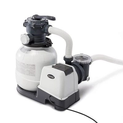 The Intex 2100 GPH Above Ground Pool Sand Filter Pump w/ Auto Timer provides cool, refreshing, clear water, and less hassle every swim season.If you are tired of buying and replacing pool filter cartridges, this filter is the one for you. With virtually no maintenance, your sand pump only needs replacement every five years.This sand pump features a powerful motor, 6-function control, and a built-in automatic timer. It meets the UL standards and is an excellent upgrade to the filter cartridge system on your Intex Above Ground Swimming Pool (Easy Set, Metal Frame, and Ultra Frame up to 12,800 gallons).This package also includes the Intex Krystal Clear Saltwater System. Its unique 2 stage technology uses an E.C.O. (electrocatalytic oxidation) process in which water molecules are split into highly powerful oxidants. Next, the amount of chlorine generated by this saltwater system is greatly reduced, which results is clean water without the potential harsh side effects of packaged pool chemicals. It requires a filter pump with a flow rate between 700 to 3,000 gallons per hour and is for use with a maximum pool size of 15,000 gallons so it pairs perfectly in this set. Maintenance is a part of every swimming pool and with this Intex Pool Sand Filter Pump and Krystal Clear Saltwater System you’ll have easy to use tools for the job, cutting down on your time spent cleaning.