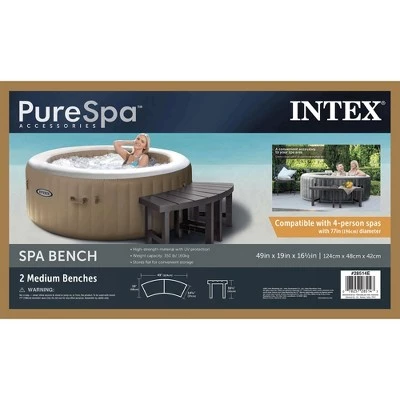 Add convenient storage or lounge area to your Intex PureSpa with this set of 2 Accessory Benches. Compatible with 4 person spas, these benches can be combined to create a larger bench and provide wrap around seating or a flat surface for towels, snacks and drinks, or your guests. Combine with multiple packages of benches and create the seating and storage that makes your spa the most comfortable spot at your home. 16.5 inch height and 19 inch depth gives these benches a large enough profile for comfort, but not so large that they are cumbersome. Each bench has a weight capacity of 350 pounds, make it durable and sturdy enough to support your items. Please note it is not a step and should not be stood on or jumped from. For convenient storage, these benches store flat. Clean storage with quick and easy set up make these benches the simple accessory that takes your spa to the next level. Add this set of 2 Medium Accessory Benches to your Intex PureSpa setup.