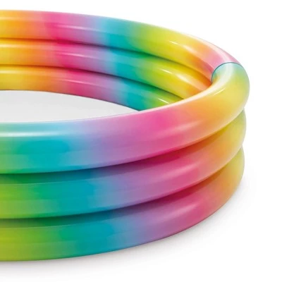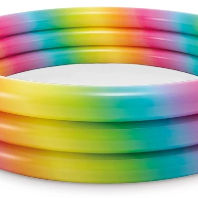 Stay cool and splash away with the Intex Rainbow Ombre Pattern 3 Ring Inflatable Kids Swimming Pool. This air-filled pool will be a great escape for the kiddos, especially on a scorching summer day.This kiddie pool is easy to set up and sits nicely on any outside surface. Simply inflate the pool to the correct size and your little ones can jump in. The pool can maintain up to 154 gallons of water and provides ample inside. In case of a leak, use the included repair patch for a quick fix.Measuring only 66 inches wide and 15 inches tall, the mini pool doesn’t take up much room at all so the kids have plenty of space to run around. Recommended for kids ages 2 years old and up, the portable pool features a rainbow design that will bring a smile to every child. Once your little tykes are done swimming, simply deflate the pool for a hassle-free clean and storage experience.Bring water-filled joy to your kids with the Intex Rainbow Ombre Inflatable Swimming Pool. . .