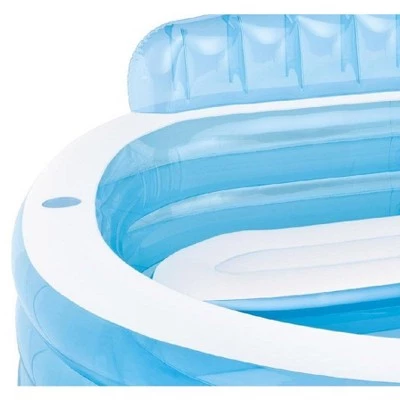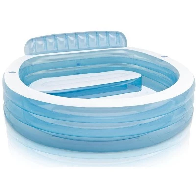 Take a splash in the Intex Swim Center Family Lounge Pool. Remarkably easy to setup, the Swim Center Family Lounge Pool requires simple quick inflation and is ready to fill with water and your little ones will be splashing and playing in minutes. Bring all the fun of the beach to your backyard and enjoy the colorful ocean graphics.Add some color and style to your backyard with the Intex Swim Centerâ„¢ Family Lounge Pool. The approximate inflated size is 88 inches long by 8 inches wide with 30-inch side walls. The water capacity is 156 gallons when filled to 12-1/2 inches of wall height. A built-in bench for parents makes it easy to relax and watch the kids at the same time.This package will also include This Intex Air Pump that is a great tool to have around any home. This Intex Air Pump includes nozzles for 3 common sizes, small, medium, and large. This allows you to use the pump in a variety of different circumstances. It’s great for inflating airbeds and pool toys in no time, and it plugs into standard household electrical outlet, so it’s convenient to use.