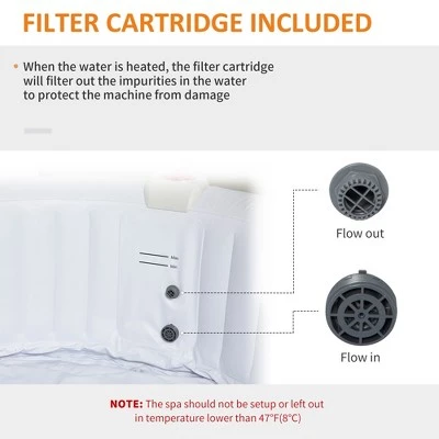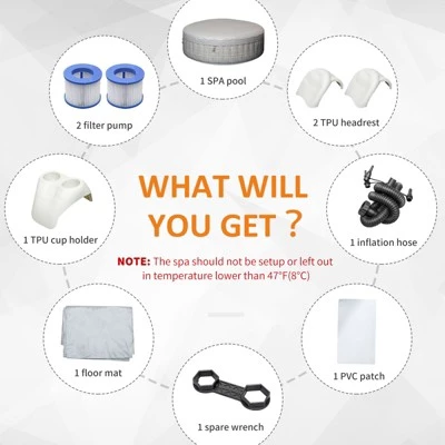 - HEAT FUNCTION: Press a button, and the water starts to heat for a soothing experience. The heating rate is 1.8 – 3.6°F(1-2℃) per hour, and the maximum temperature can reach 104°F. This means you have plenty of options to decide exactly what temperature you want for the spa! Please note that the spa should not be set up or left out when the outdoor temperature is lower than 47°F.