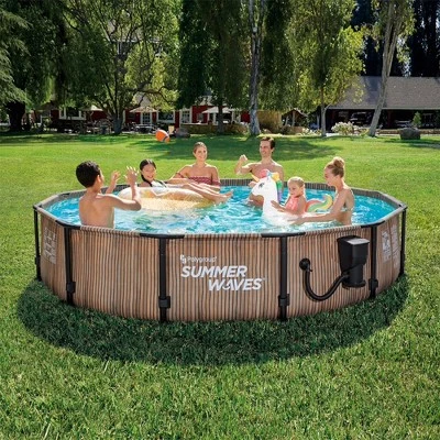 Beat the summer heat with the Summer Waves Natural Teak Elite 12′ x 30″ Round Frame Above Ground Swimming Pool. This durable backyard pool has a stylish Natural Teak exterior print that adds extra flair to any backyard. To make setup easier and more convenient than ever before, this above-ground pool features SmartConnectâ„¢ technology, allowing you to let up quickly and get the summer fun started. Simply connect the poles together until there’s a click, and the frame will remain sturdy all summer long. The modern matte finish on all ultra-strong oval poles protects against scratches and corrosion, making the pool more durable year after year. The premium Elite frame pool comes with a powerful filter pump, ensuring the water is clean for swimmers to indulge in. This pool can comfortably accommodate up to 6 people, giving you the space to swim, play and float inside with your family and friends at the same time.Create a backyard oasis to share with your loved ones with the Natural Teak Elite 12′ x 30″ Round Frame Above Ground Swimming Pool from Summer Waves.