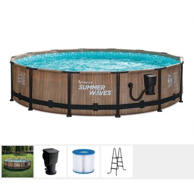 Beat the summer heat with the Summer Waves Natural Teak Elite 14′ x 36″ Round Frame Above Ground Swimming Pool. This durable backyard pool has a stylish Natural Teak exterior print that adds extra flair to any backyard. To make setup easier and more convenient than ever before, this above-ground pool features SmartConnectâ„¢ technology, allowing you to let up quickly and get the summer fun started. Simply connect the poles together until there’s a click, and the frame will remain sturdy all summer long. The modern matte finish on all ultra-strong oval poles protects against scratches and corrosion, making the pool more durable year after year. The premium Elite frame pool comes with a powerful filter pump, ensuring the water is clean for swimmers to indulge in. There is also a SureStep ladder to access the pool conveniently and safely. This pool can comfortably accommodate 6 to 7 people, giving you the space to swim, play and float inside with your family and friends at the same time.Create a backyard oasis to share with your loved ones with the Natural Teak Elite 14′ x 36″ Round Frame Above Ground Swimming Pool from Summer Waves.
