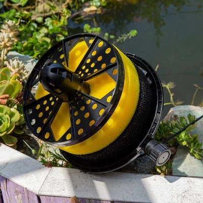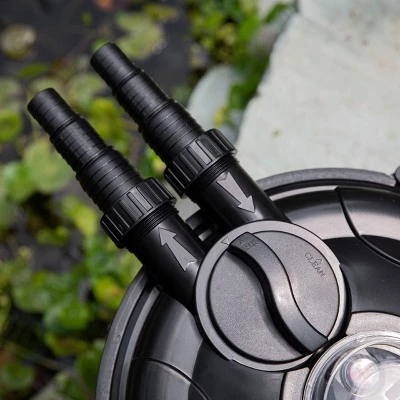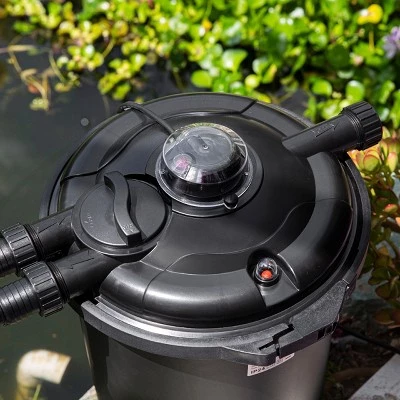2700-gallons koi pond pressure bio filter. The bio filter is designated for filtering normal pond water. This pond pressure bio filter comes with an integrated 13W clarifier, a lamp indicator, inlet and outlet hose adapters, and a multi-directional valve for cleaning. This efficient pond filter is capable of filtering up to 2500 gallons, and it is very easy to maintain and comes with all the parts ready to install